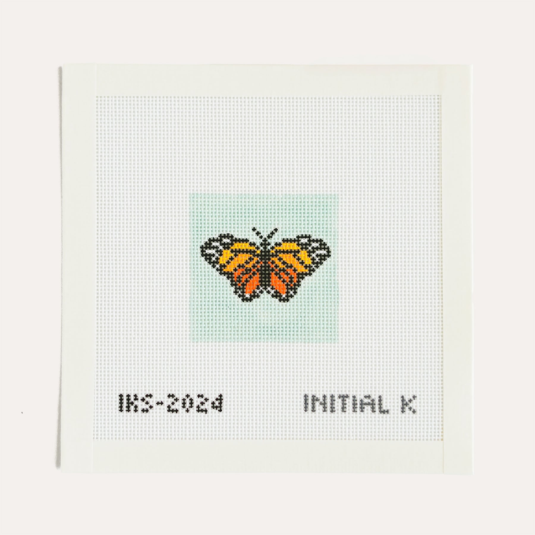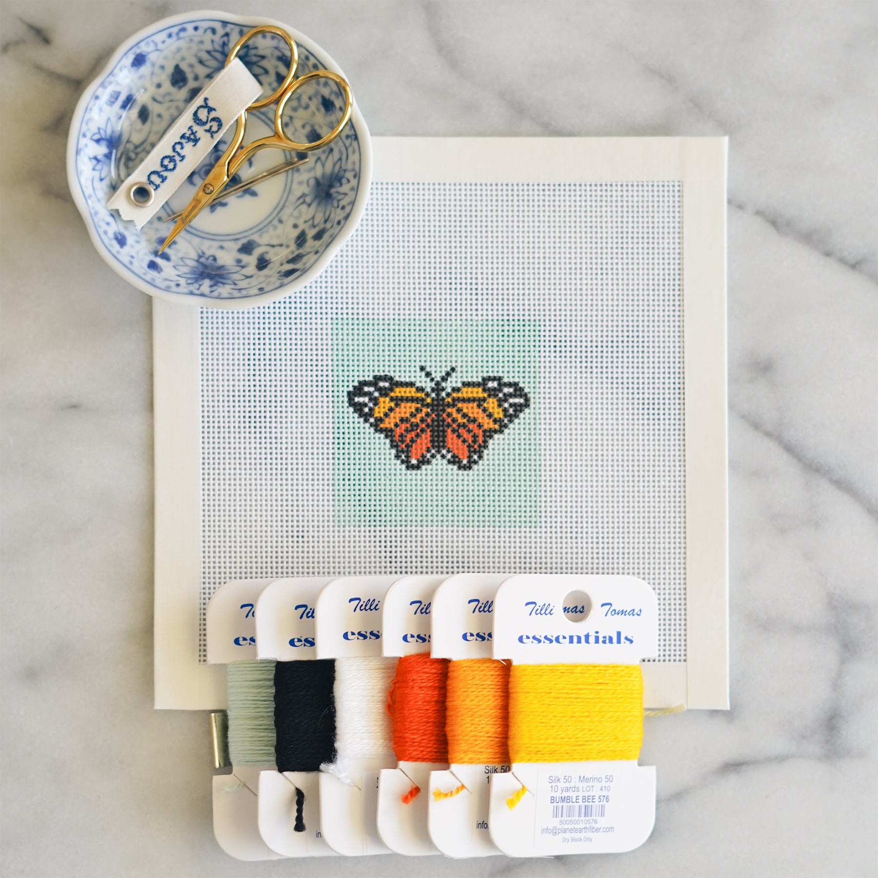 The Mini Monarch features a bold butterfly design in bright oranges and red, hand-painted on 18 mesh canvas. Design size is 2.2 inches square, making it an ideal weekend project or giftable accent.