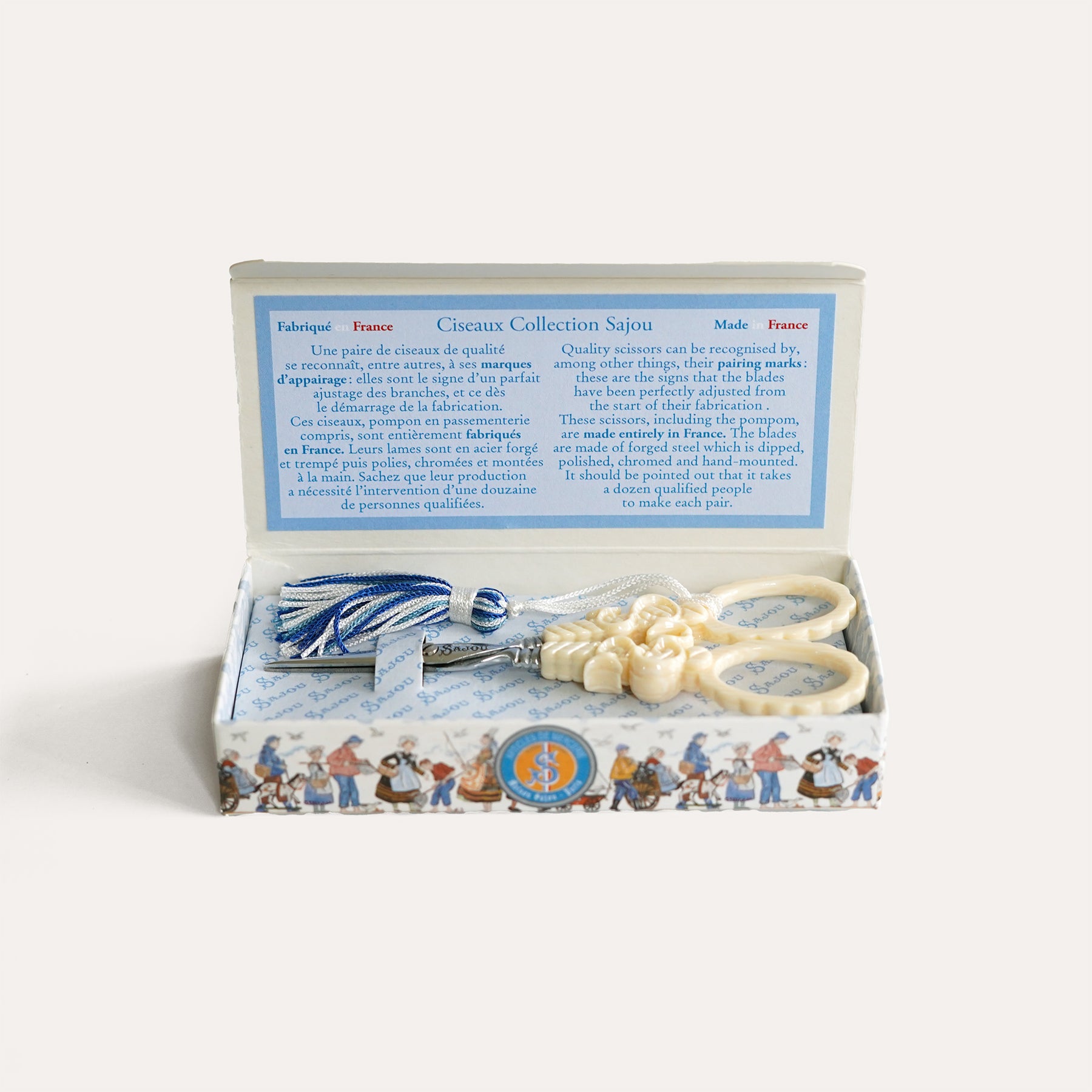 A refined addition to Sajou Maison’s Private Collection, these veined ivory–style embroidery scissors feature the signature Sajou “S” on each handle and a delicate festoon design around the finger rings. Measuring 11.8 cm, they are exceptionally light and beautifully balanced, offering precision and comfort with every stitch. Each pair includes a matching pompom and arrives in a small Sajou box. Entirely made in France by expert artisans.