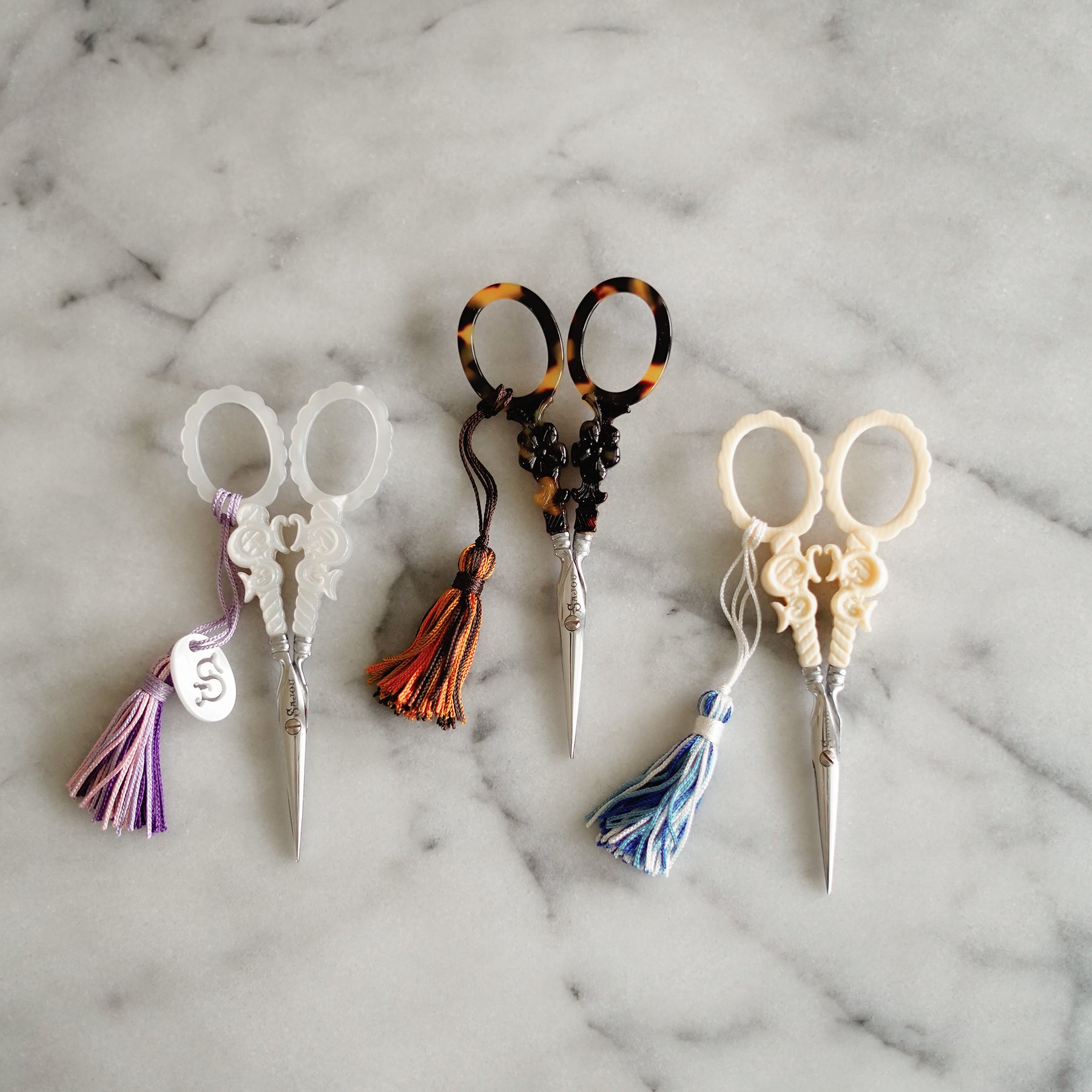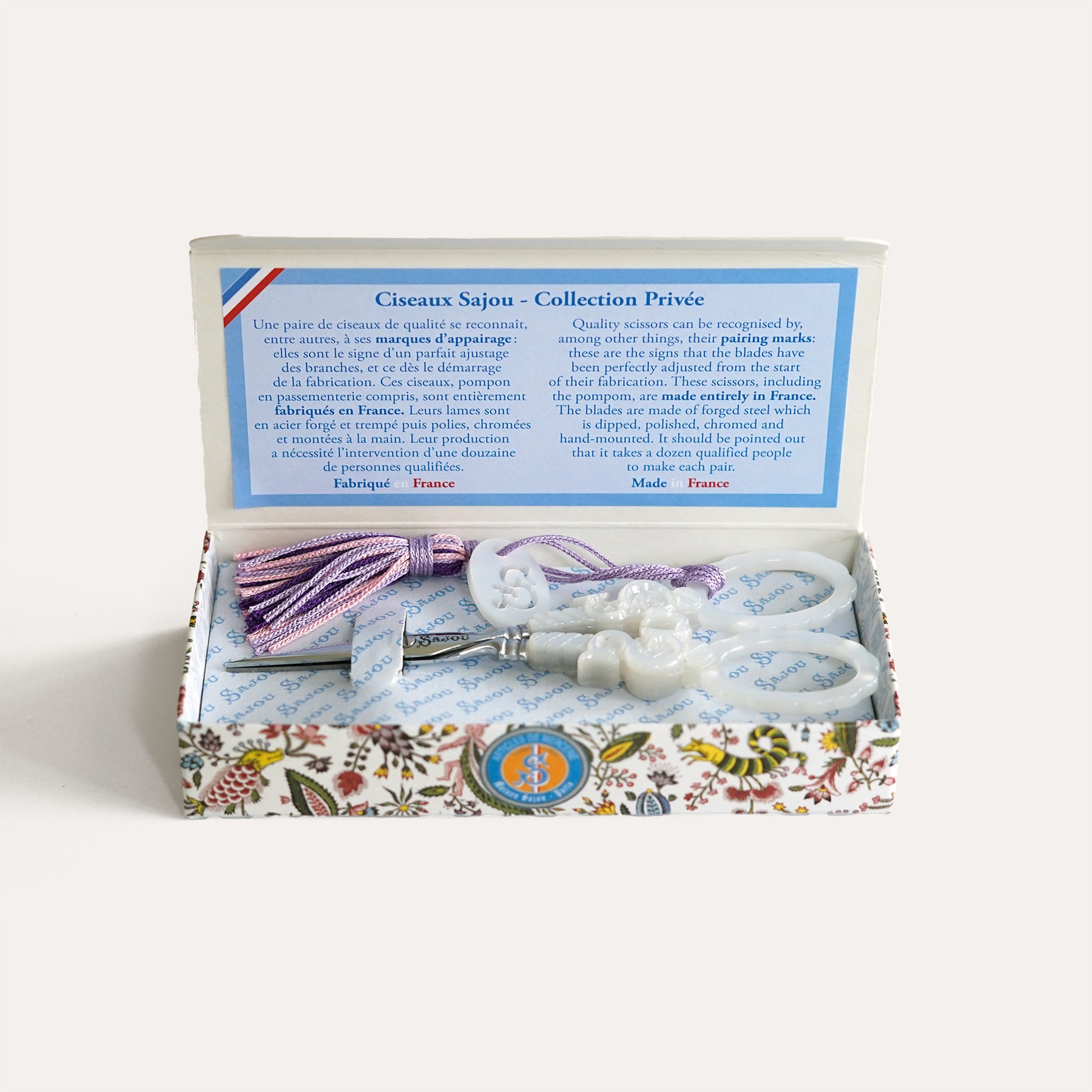 A timeless addition to Sajou Maison’s Private Collection, these embroidery scissors feature imitation mother-of-pearl handles adorned with the signature Sajou “S” and elegant festoon detailing around the finger rings. Measuring 11.8 cm, they are lightweight, balanced, and made for precision work. Each pair includes a decorative pompom and comes presented in a small Sajou box. Entirely made in France by skilled artisans.