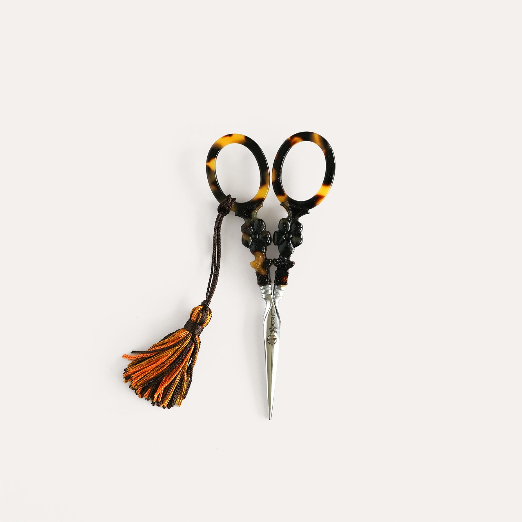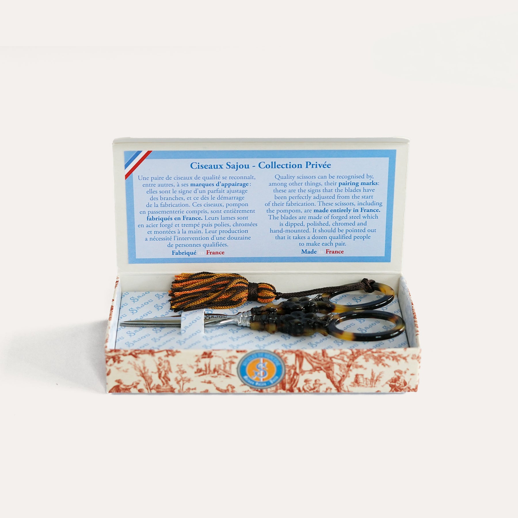 Inspired by the elegance of the Charles X era, this pair of Sajou Maison embroidery scissors features tortoiseshell-style handles and fine, delicate blades. Measuring 11.8 cm, they are exceptionally light and beautifully balanced for precise, effortless stitching. Each pair includes a matching decorative pompom and comes presented in a small Sajou box. Entirely made in France by skilled artisans.
