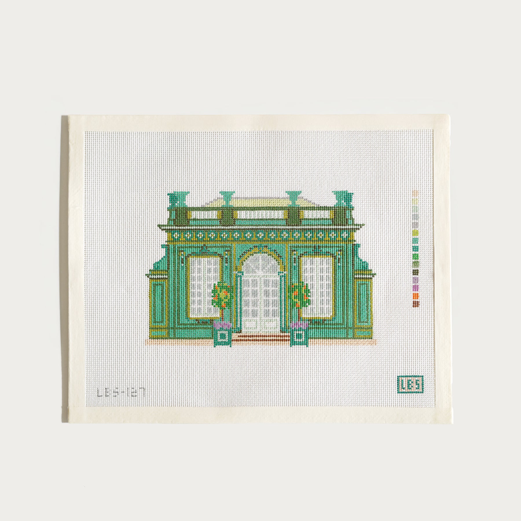 Capture the charm of French elegance with our Le Pavillon Frais needlepoint canvas. Inspired by the classical garden pavilion, this beautifully detailed design is hand-painted on 18 mesh mono canvas. Measuring 6.5" x 4.5", it's the perfect project for those who love architectural details and timeless designs.